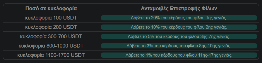 Ανάλογα με το ποσό επένδυσης, ξεκλειδώνουν τα επίπεδα προμηθειών ως ακολούθως :