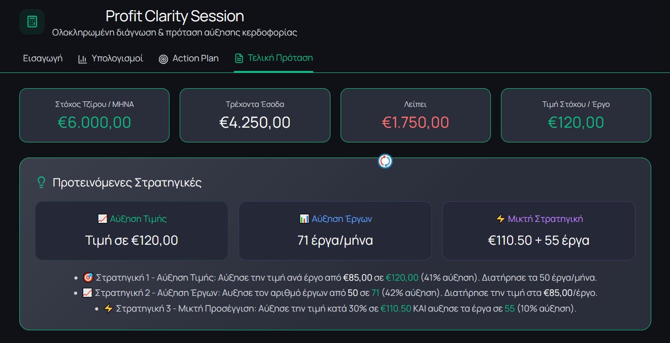 Σε μόλις 45 λεπτά ζωντανής 1:1 online στρατηγικής συνεδρίας, με το Profit Clarity Calculator θα ανακαλύψουμε πού χάνεις χρόνο και χρήμα, ποια βήματα θα φέρουν αποτέλεσμα και πώς να σχεδιάσεις το πλάνο δράσης που θα σε οδηγήσει στον στόχο σου.